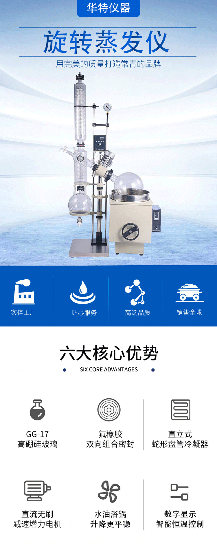 蒸發瓶恒速旋轉,水浴鍋恒溫加熱,在此條件下:物料在蒸發瓶內壁形成大面積均勻薄膜快速蒸發,在真空條件下可以提高蒸發效率(需連接真空裝置),溶媒蒸汽經玻璃冷凝盤管時冷卻成液體(需連接冷卻裝置),回收于收集瓶。