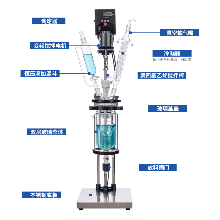 本機具有電動恒速攪拌系統、冷凝、滴加系統,釜體夾層需外接加熱或制冷的循環設備。在攪拌物料的同時,通過夾層注入循環的熱溶液或冷卻液,對釜內的物料進行恒溫的加熱或制冷。物料進行加熱反應時,在真空條件下可以提高蒸發效率(需連接真空裝置),溶媒蒸汽經玻璃冷凝盤管時冷卻成液體(需連接冷卻裝置),可回流到釜內,也可通過回流彎頭下部閥門進行回收。反應完畢,物料可從釜底的側出料口放出。