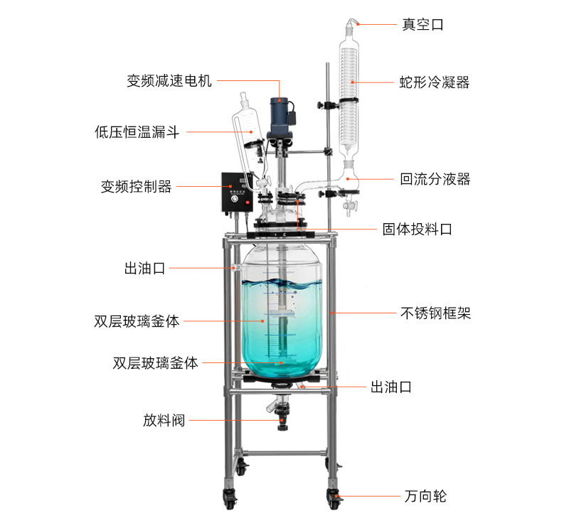 雙層玻璃反應(yīng)釜內(nèi)層放置反應(yīng)溶媒可做攪拌反應(yīng),夾層可通過(guò)冷熱源(冷凍液、水或熱油做恒溫加熱/冷卻反應(yīng),是現(xiàn)代合成化工生物制藥和新材料制備的理想實(shí)驗(yàn)/中試/生產(chǎn)設(shè)備。