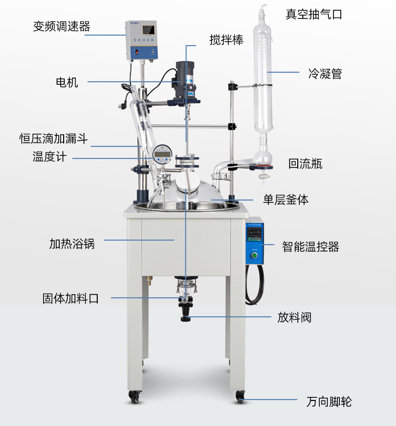 單層玻璃反應釜配套高溫油水浴鍋,提供單層玻璃反應釜需求熱熔媒;或者額外配置浴鍋冷凝盤管,提供單層玻璃反應釜需求冷熔媒;從而對反應釜內的物料進行恒溫加熱或制冷。物料在反應釜內進行反應,并能控制反應溶液的蒸發與回流等一系列實驗過程,反應完畢,規格為10L以上單層玻璃反應釜物料可從釜底的全密封放料口放出,操作極為方便。
