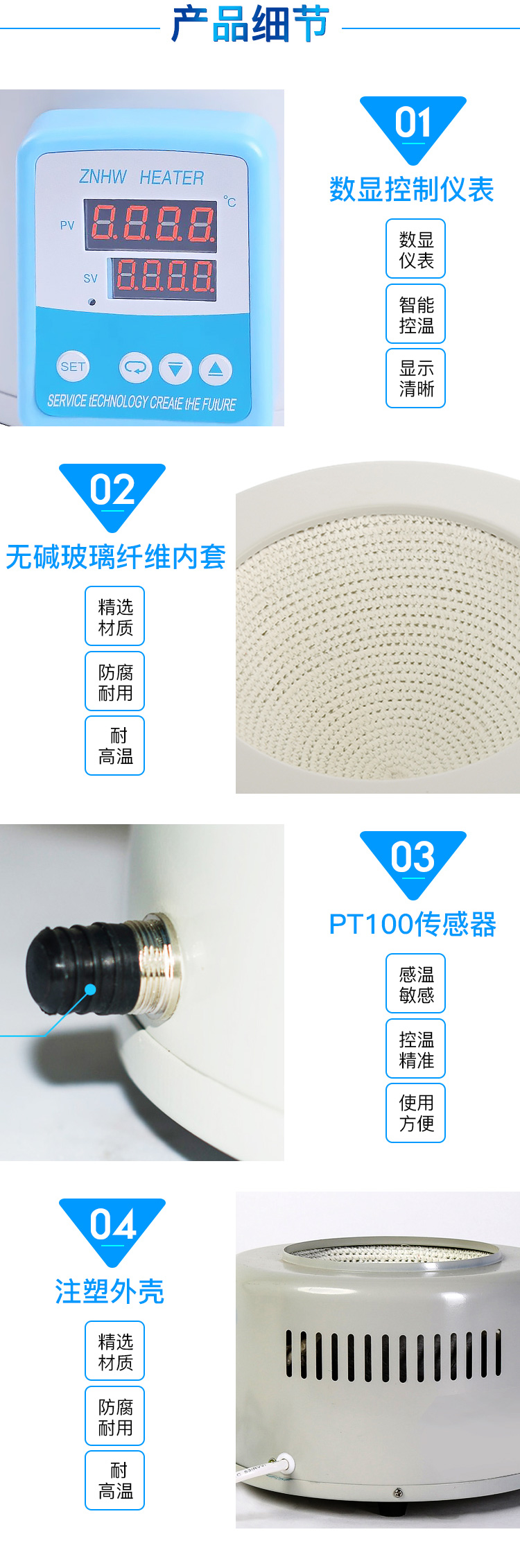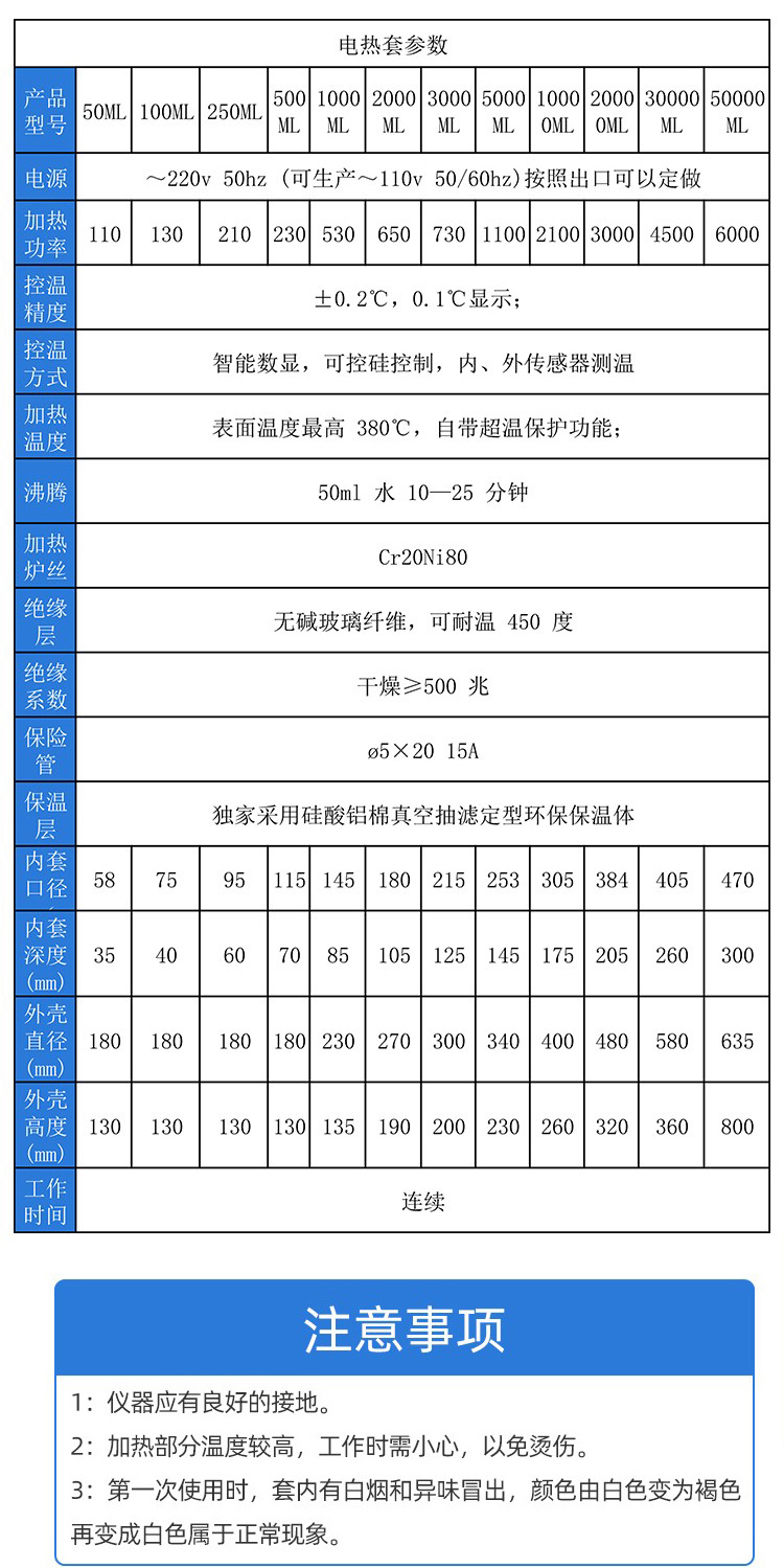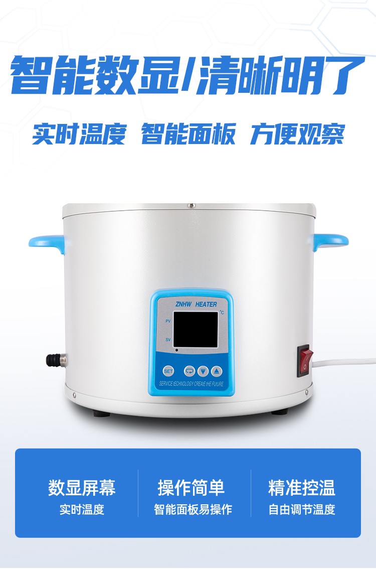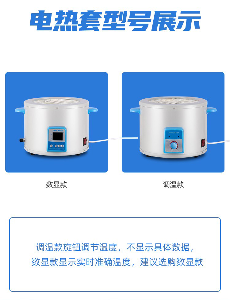 ZNHW型智能數顯電熱套是用無堿玻璃纖維作絕緣材料,將Cr20Ni80合金絲簧裝置于其中,用硅酸鋁棉經真空定型的半球形保溫體保溫,外殼一次性注塑成型,上蓋采用靜電噴塑工藝,由于采用球形加熱,可使容器受熱面積達到60%以上。